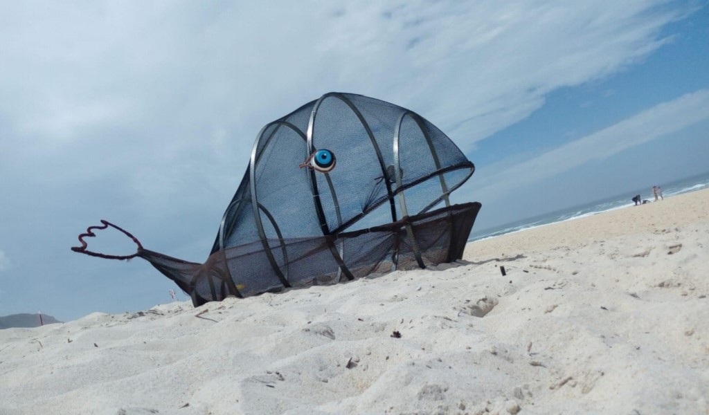 Construída em ferro e redes, esta baleia faz parte integrante do projecto Caça-plásticos, desenvolvido pelo Exploratório de Ciência Viva de Coimbra. A iniciativa convida os veraneantes a alimentar a baleia com o plástico que possam recolher na praia.