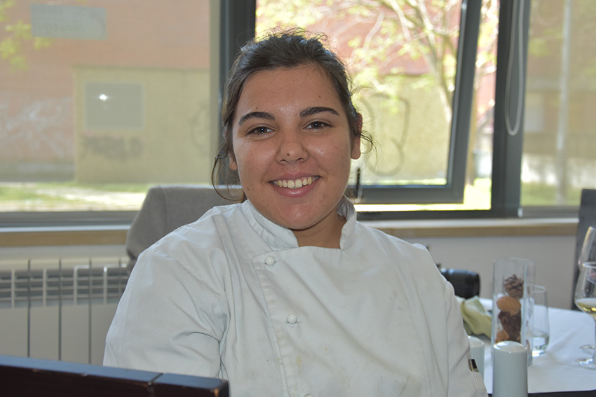 Adriana Santos, de 19 anos e natural do Bombarral, está a frequentar o terceiro ano de Técnicas de Cozinha e Pastelaria. No próximo ano pretende prosseguir estudos no polo de Óbidos, para tirar o nível 5 de Pastelaria.