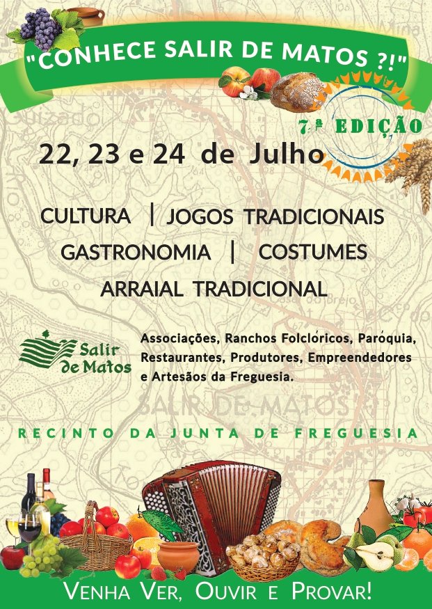 A Junta de Salir de Matos agendou para 22, 23 e 24 de julho a 7ª edição do “Conhece Salir de Matos?!”, cujo lema é “Venha Ver, Ouvir e Provar!”.