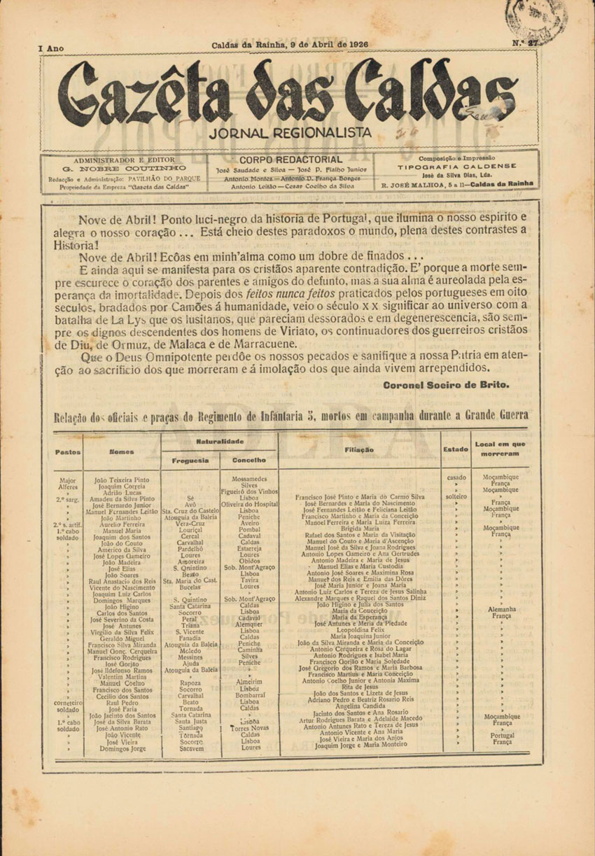 Mas para que esta homenagem seja possível, quase 100 anos após a intenção há um nome que é incontornável: Mário Lino, que no âmbito do seu trabalho no Museu de Ciclismo, na preparação da exposição “Memórias de Outros Tempos”, em 2008, quis fazer uma listagem dos caldenses que tinham perdido a vida no conflito. Começou pelos jornais Círculo das Caldas e Gazeta das Caldas,este último que havia sido fundado em 1925 e que, no segundo ano de existência, a 9 de abril, assinalando La Lys, apresenta na primeira página um quadro com os oficiais e praças do RI5 mortos em campanha. Uma particularidade é que a Gazeta das Caldas estava sedeada nos Pavilhões do Parque, que era a casa do Batalhão de Ciclistas nº2, criado onde antes estava o RI5 e para onde voltou depois da curta existência do BC2 na cidade termal. Mais, é que era na biblioteca do BC2 que ficava sedeado… o Núcleo das Caldas da Liga dos Combatentes!