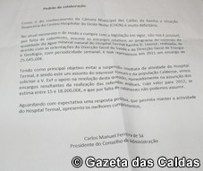 “Tendo como principal objectivo evitar a suspensão imediata da actividade do Hospital Termal, e sendo este um assunto de interesse comum e da população caldense, vimos solicitar a V. Exªa o apoio na resolução nesta questão”, pede Carlos Sá.