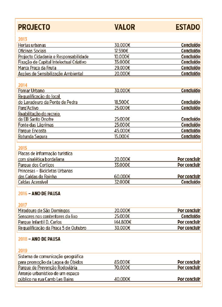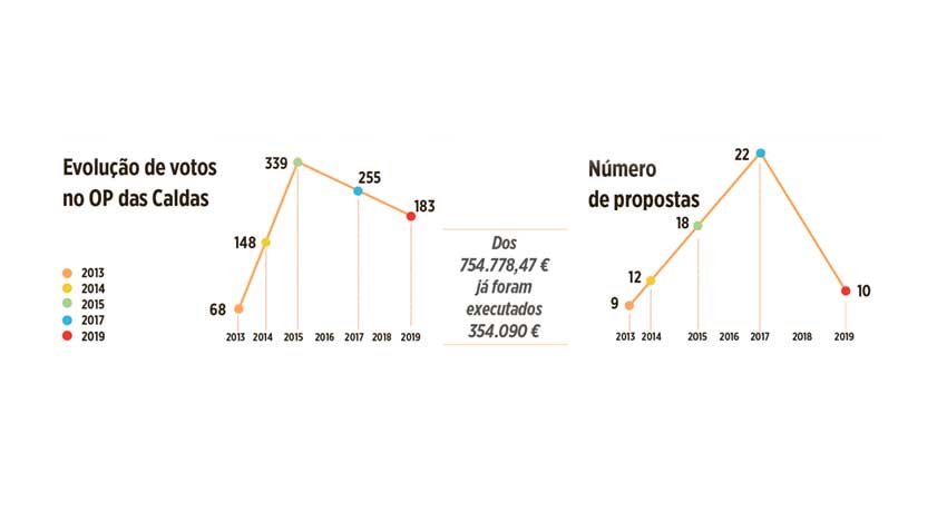 Nas Caldas, o Orçamento Participativo existe desde 2013 e já recebeu 71 propostas. Dos 24 projectos eleitos pelos caldenses, nove estão por executar e correspondem a uma verba a rondar os 400 mil euros (dos mais de 750 mil euros totais). A votação tem vindo a descer e nos últimos dois anos votaram naquele instrumento menos 150 pessoas