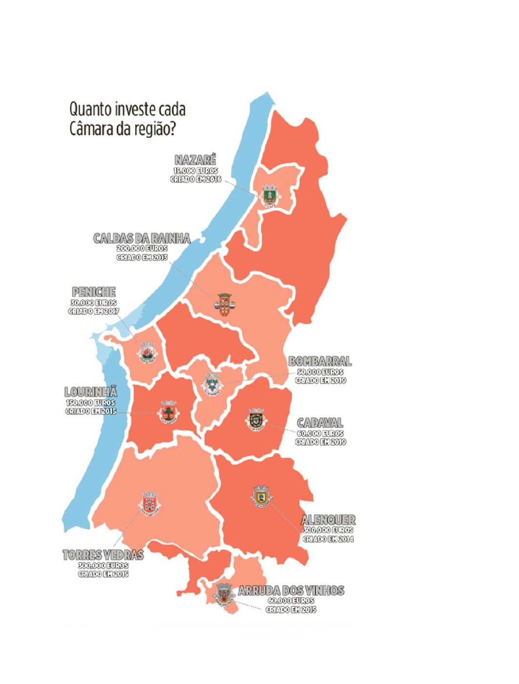 Nas Caldas o OP atingiu os 200 mil euros e na Lourinhã os 150 mil euros. Cadaval e Arruda dos Vinhos dedicam 60 mil euros cada, mais 10 mil que a autarquia do Bombarral. Peniche deixa os cidadãos escolherem onde gastar 30 mil euros e a Nazaré metade desse valor.