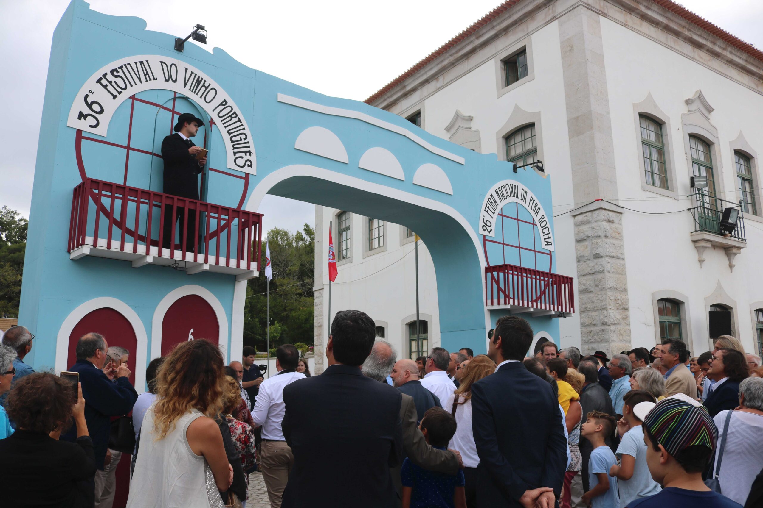 O festival do vinho e da pêra rocha decorre até domingo, 11 de Agosto, sendo dedicado ao importante empresário do sector vinícola, Abel Pereira da Fonseca, que fundou no séc. XX a Companhia Agrícola do Sanguinhal. A fachada de um dos armazéns que Abel Pereira da Fonseca detinha em Lisboa inspira a entrada do certame.