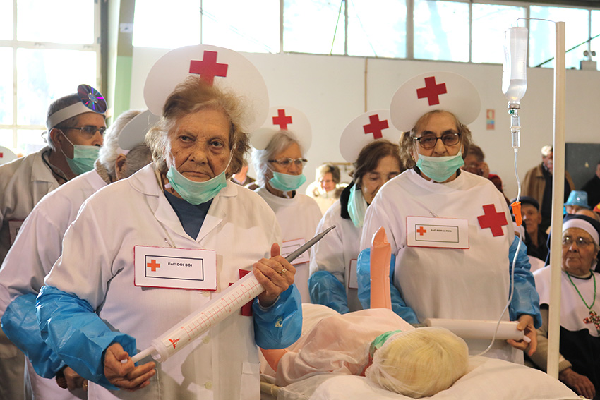 Cada um dos participantes tem uma placa identificativa, com nomes bem próprios. Falamos com a Enfermeira Com Pressa – a jovem de 97 anos Isabel Vitorino. É a Enfermeira com Pressa porque quer sempre fazer tudo depressa.