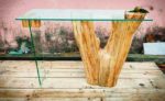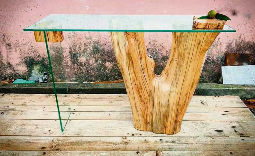 Samuel Jacinto tem 35 anos e afirma-se como “um designer com muitas influências de artesão ou um artesão com traços de designer”. E isto porque o que o move é a vontade de criar, como “um miúdo em volta de um Lego”, diz o designer industrial, a quem interessa encontrar soluções, além de ter grande gosto em trabalhar com os materiais. O gosto pelo trabalho na madeira já vem de herança familiar, pois Samuel Jacinto tem tios-avós que foram carpinteiros. “Neste tipo de matéria há um grande desperdício”, contou o autor, que resgata toros que teriam como destino a queima ou o abandono. E nas suas mãos a madeira ganha nova vida, depois de desinfestada, seca e tratada. Junta-lhes tampos de vidro e, por isso, velhos cepos e troncos ganham nova vida, transformados em mesas ou em espelhos que ficam unidos ao material nobre que é a madeira. “Há peças que eu faço que não são propriamente invenções”, contou o designer explicando que não há uma peça igual à outra já que as características da madeira determinam que cada trabalho seja único. Faz mesas a partir de troncos ou espelhos enquadrados em madeira que muitas pessoas não dão valor que era para queimar ou estar a apodrecer. Muitas vezes, este autor vai ao carpinteiro e adquire madeira, por baixo custo, que tinha destino ir para o lixo. Também trabalha desperdício deste matéria natural que é oriunda do Parque e da Mata.