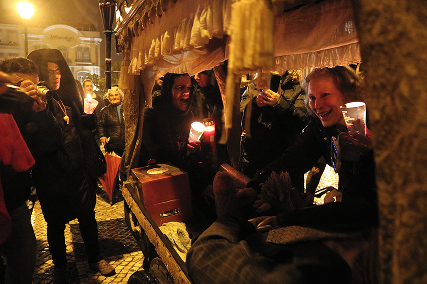 Numa noite de 14 de Fevereiro em que a chuva não deu tréguas, mais de uma centena de enlutadas viúvas carpideiras disseram adeus ao Entrudo deste ano. Entre muitas lamúrias e brincadeiras, o tradicional cortejo fúnebre terminou junto à Biblioteca Municipal, onde em vez de enterrado, o Carnaval foi cremado, para renascer das cinzas no próximo ano. “Ai coitadinho, ele era tão bom… Quando estava a dormir”, diz uma viúva. “Nem isso, que ele ressonava alto!”, responde outra. “Vocês são todas amantes, que ele, mulher, só tinha uma e era eu”, exclama outra. “Deixa lá, eu só quero é a reforma”, retorquiu uma quarta. “Era mas é um felizardo, tinha-as todas para ele”, diz um dos envolvidos na tarefa de carregar o defunto na carreta da agência funerária “Ká Te Espero”. MENOS GENTE POR CAUSA DOS NAMORADOS José Oliveira vem enterrar o entrudo desde que vive nas Caldas, há cinco anos. Este ano assumiu o papel de cremador que antes não existia, depois de no último ano ter andado com a candeia em frente à carreta. “Isto quer é inovação”, afirmou.