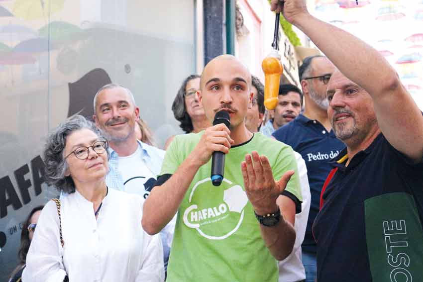 Foi num clima de grande festa que se inaugurou, no passado sábado, a intervenção de comerciantes na Rua da Liberdade, com a colocação de mais de 600 chapéus de chuva coloridos, com um tradicional falo caldense em cerâmica no cabo, onde se pega. Chamam-se Chafalos e são uma criação de Zélia Marques e do filho, Tomás, que idealizaram e registaram a marca. Depois, foi Helena Brito, que também é comerciante daquela rua, quem os produziu. O trio de mulheres responsável pela iniciativa completa-se com Rosário Delgado, da pastelaria Gato Preto, que foi responsável pela animação da rua, que neste dia recebeu também flores e bancos (recuperados com a oferta de madeira de Manuel Barreto).