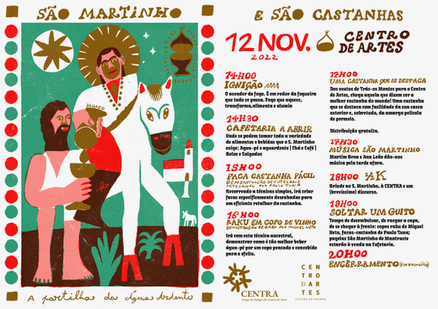 A CENTRA – Grupo de Amigos do Centro de Artes, vai realizar no próximo sábado, 12 de Novembro, entre as 14h e as 20h, um Magusto no jardim e Cafetaria do Centro de Artes. Esta iniciativa, designada “São Martinho e São Castanhas” é realizada em estreita colaboração com o Centro de Artes e marca o reinício da atividade da Centra, após um período de inatividade, contando com diversas atividades.