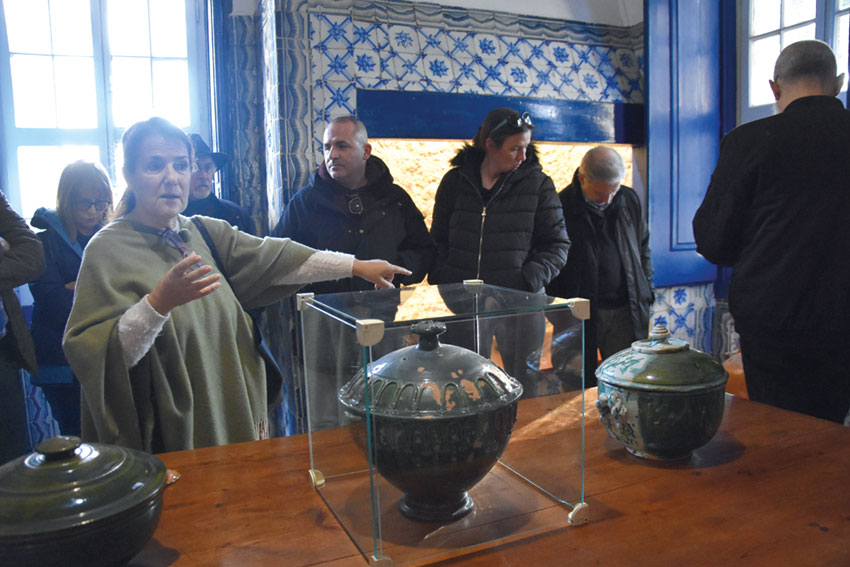 Já durante a tarde, o percurso pelo Museu de Cerâmica foi guiado por Margarida Araújo pela coleção do Museu, patente no Palacete que pertenceu ao Visconde de Sacavém. Este tinha um atelier cerâmico que funcionou entre 1892 e 1896 e que teve como responsável o escultor austríaco José Füller. O edifício foi adquirido pelo Estado em 1981 e o Museu de Cerâmica foi criado dois anos depois. Uma das peças da coleção, que Margarida Araújo apresentou com detalhe ao grupo, foi um prato que foi pintado pelo Rei D. Carlos, que era visita regular do atelier. A investigadora contou vários pormenores sobre a coleção desde as peças oláricas, passando pelas de Maria dos Cacos até chegar à contemporaneidade com as propostas de Eduardo Constantino, Ferreira da Silva e de Armando Correia.