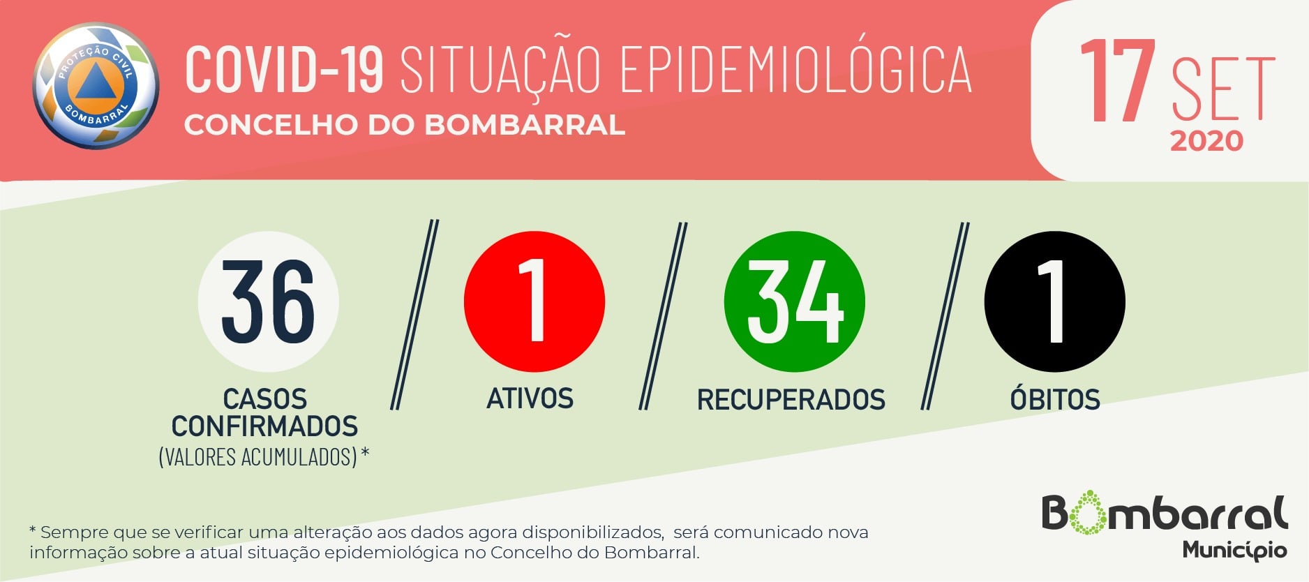 Depois de mais de um mês sem casos activos, o Bombarral voltou a registar esta quinta-feira um novo caso confirmado de COVID-19. Assim, à data de hoje, registam-se 36 casos confirmados, um caso ativo, 34 recuperados e um óbito.