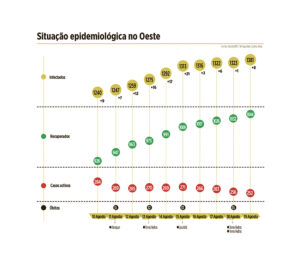 A Lourinhã regista um aumento de quatro casos activos, uma recuperação e uma morte a lamentar. No Oeste sul, Alenquer tem vindo a registar uma diminuição das pessoas infectadas. Contava na passada quarta-feira com 13 casos activos, menos oito do que na semana passada. Também em Arruda dos Vinhos e Sobral de Monte Agraço se verifica uma diminuição dos casos de infecção e aumento das recuperações.