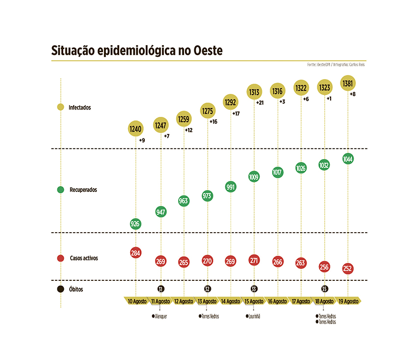 A Lourinhã regista um aumento de quatro casos activos, uma recuperação e uma morte a lamentar. No Oeste sul, Alenquer tem vindo a registar uma diminuição das pessoas infectadas. Contava na passada quarta-feira com 13 casos activos, menos oito do que na semana passada. Também em Arruda dos Vinhos e Sobral de Monte Agraço se verifica uma diminuição dos casos de infecção e aumento das recuperações.