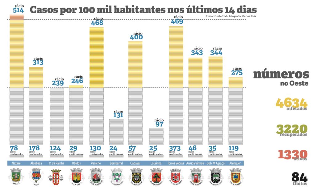 Com base nos dados do relatório epidemiológico da passada terça-feira fornecidos pela Comunidade Intermunicipal do Oeste e nos dados populacionais dos Censos 2011, a Gazeta das Caldas procedeu ao cálculo do rácio de cada concelho do Oeste nos últimos 14 dias (entre as 23h59 de 9 de novembro e o mesmo horário do dia 23 do mesmo mês, que eram os últimos dados disponíveis à data de fecho desta edição) para fornecer aos leitores uma análise o mais atual possível.