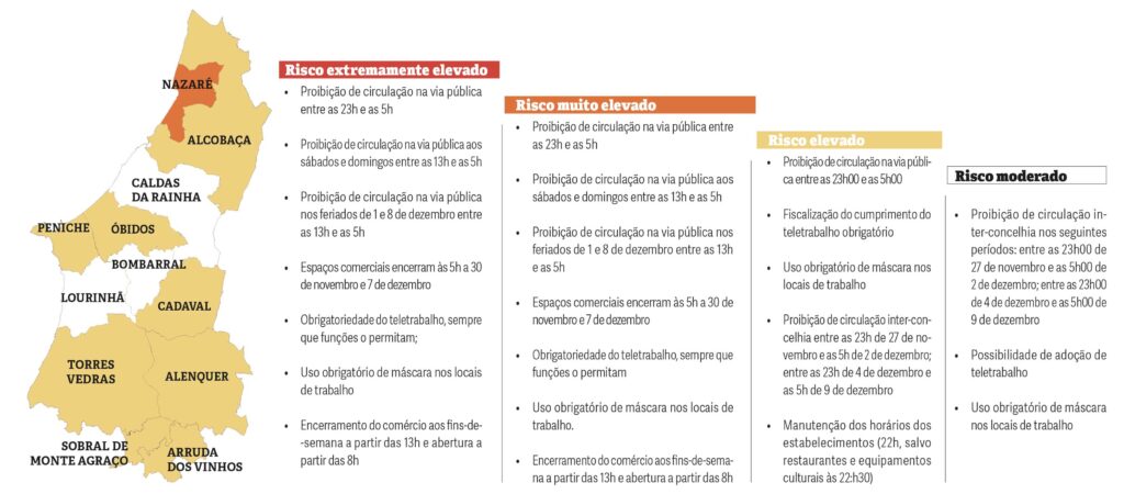 Caldas da Rainha, Óbidos, Bombarral e Lourinhã foram os únicos três concelhos da região a escapar às medidas mais restritivas do governo, sendo que Alcobaça, Peniche e Sobral de Monte Agraço se juntaram a Cadaval, Alenquer, Torres Vedras e Arruda dos Vinhos na lista dos municípios em risco considerado elevado.