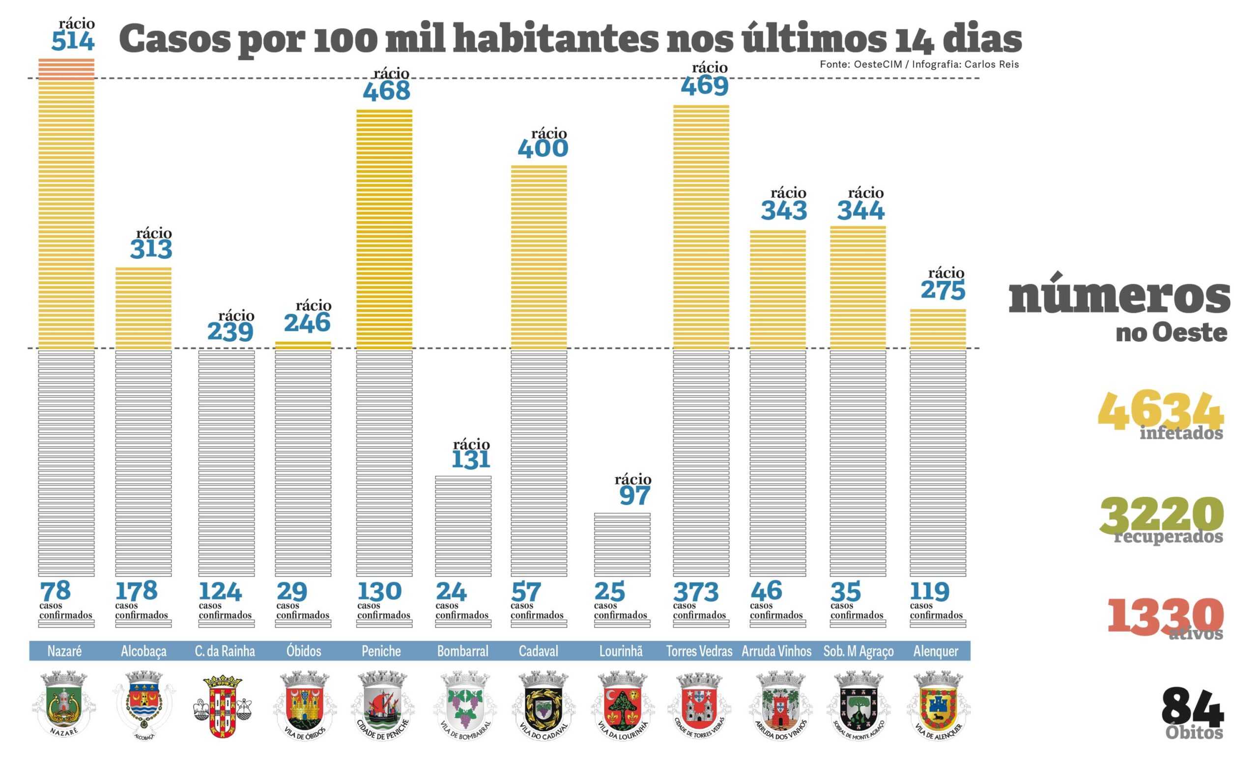 Com base nos dados do relatório epidemiológico da passada terça-feira fornecidos pela Comunidade Intermunicipal do Oeste e nos dados populacionais dos Censos 2011, a Gazeta das Caldas procedeu ao cálculo do rácio de cada concelho do Oeste nos últimos 14 dias (entre as 23h59 de 9 de novembro e o mesmo horário do dia 23 do mesmo mês, que eram os últimos dados disponíveis à data de fecho desta edição) para fornecer aos leitores uma análise o mais atual possível.