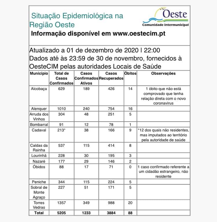 A região atingiu os 5205 casos confirmados desde o início da pandemia, com os novos casos, referentes a 30 de novembro, repartidos por Torres Vedras (23), Arruda dos Vinhos (10), Alcobaça (7), Caldas da Rainha (7) e Peniche (4).
