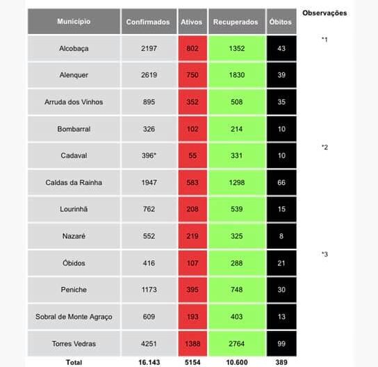 Quanto aos óbitos, foram registados em Torres Vedras (5), Alcobaça (4), Alenquer (4), Caldas da Rainha (3) e Óbidos (3), o que faz aumentar o total para 389 e a taxa de mortalidade nos casos concluídos para 3,54%, o valor mais alto desde 27 de julho.