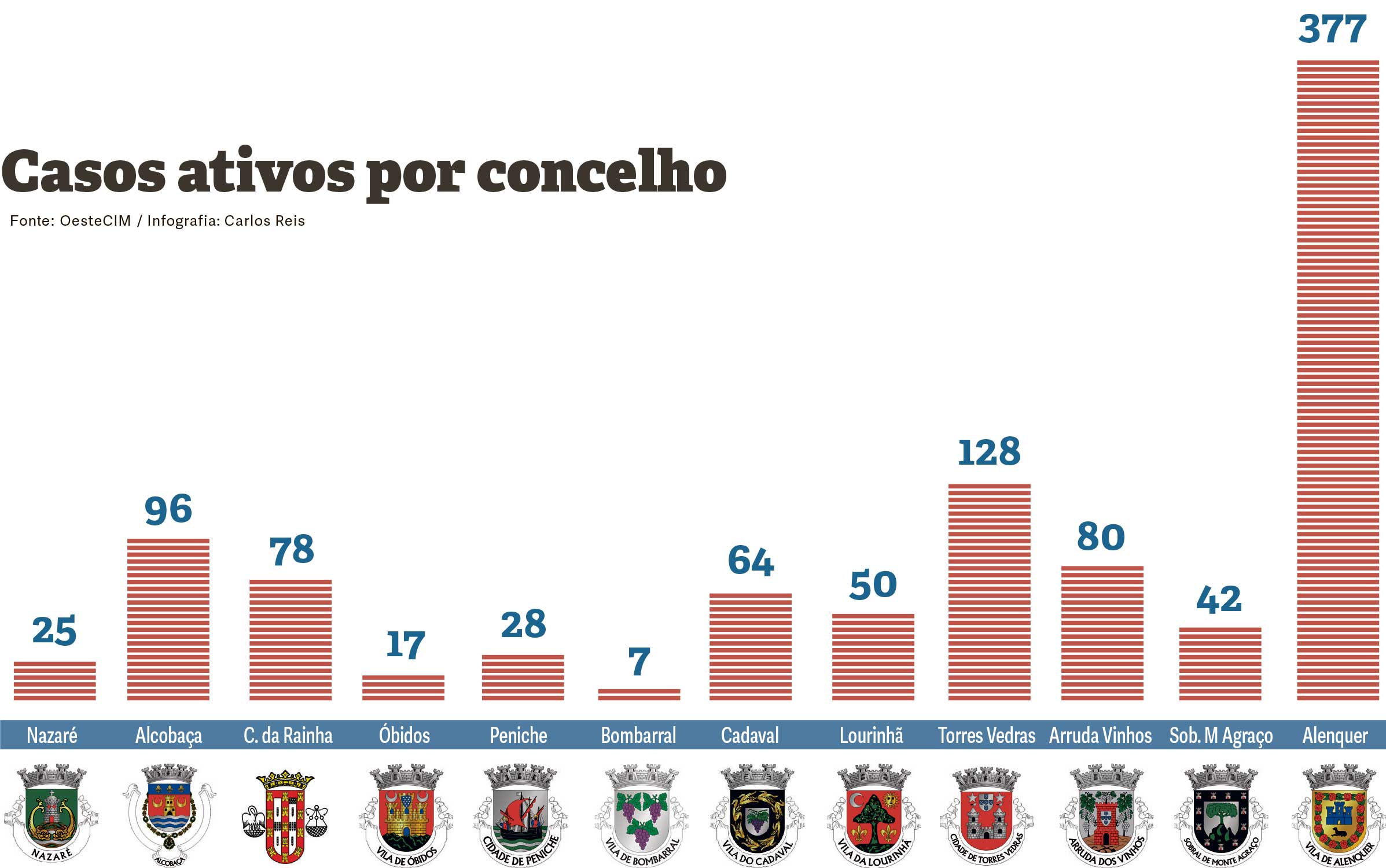 O concelho com mais casos ativos é o de Alenquer, com 377, seguindo-se Torres Vedras, com 128. Alcobaça tem 96 ativos e Arruda dos Vinhos 80.