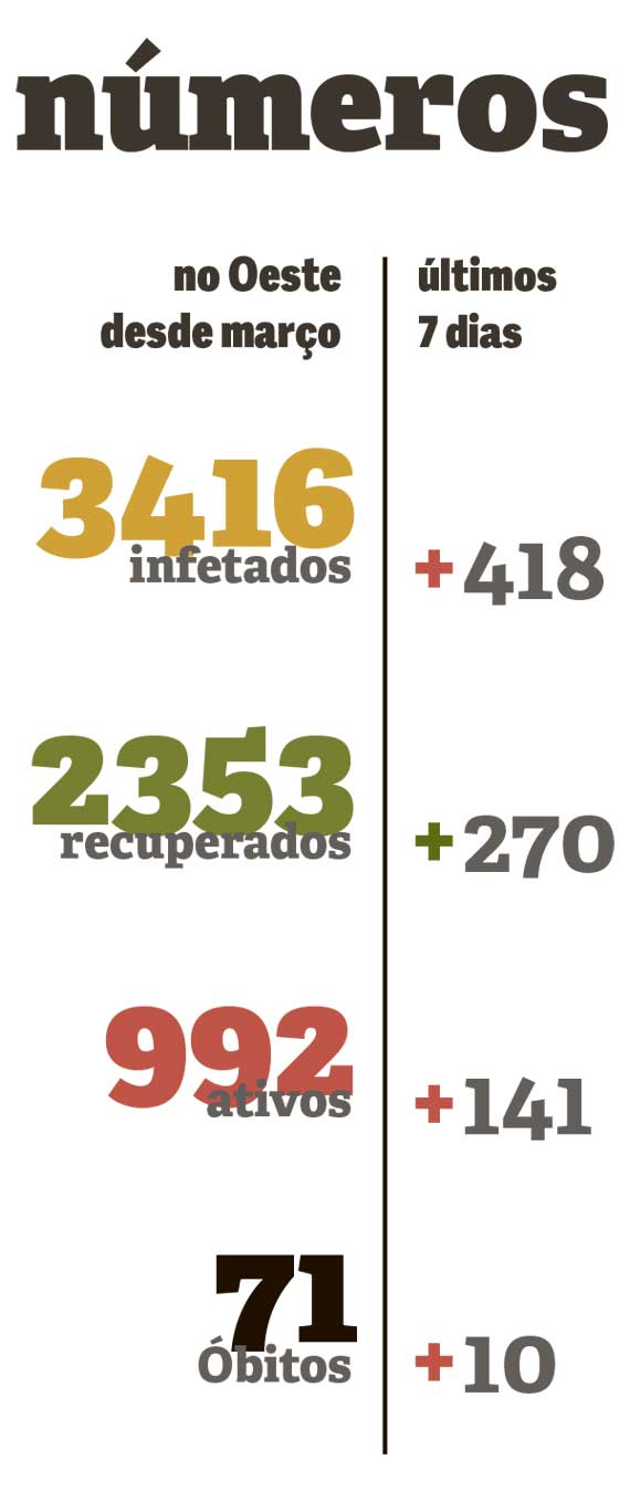 Ao dia de fecho desta edição, e além dos quatro concelhos já incluídos na lista dos 121 com medidas mais restritivas (Cadaval, Alenquer, Arruda dos Vinhos e Sobral de Monte Agraço), nenhum concelho do Oeste chegava ao número de casos definido pelo Governo (tendo como base os dados populacionais dos Censos 2011). Os critérios passam pela confirmação de 240 novos casos por cada 100 mil habitantes nos últimos 14 dias.