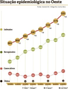 No caso das Caldas, e segundo os dados da Comunidade Intermunicipal do Oeste, há mais 22 casos, aumentando o número de ativos para 30 (eram 13 na última semana). Na Nazaré há mais nove casos e em Alcobaça seis (mas há menos um ativo). Em Óbidos há um novo caso (mantendo-se apenas um ativo) e em Peniche foram confirmados mais quatro, registando-se ainda assim um decréscimo nos ativos (menos 12 do que os 53 da semana passada). No Bombarral há mais dois casos (mas menos seis ativos) e na Lourinhã mais oito (mas menos quatro ativos). No Cadaval há mais seis casos, em Arruda dos Vinhos 18 e no Sobral de Monte Agraço 10. Os concelhos com mais casos (e com mais novos casos) são Alenquer (mais 55) e Torres Vedras (mais 39).
