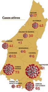 A taxa de casos ativos por milhar de habitantes ultrapassa agora os 1,3 quando na última semana ficava acima de 1,2 casos por cada mil pessoas. Nesse índice o concelho com a taxa mais alta do Oeste é Arruda dos Vinhos (4,8), seguindo-se Alenquer (3,7) e Sobral de Monte Agraço (2,2). Acima da média do Oeste está, ainda, Peniche (1,4). Nas Caldas esta taxa mais que duplicou, atingindo os 0,5.
