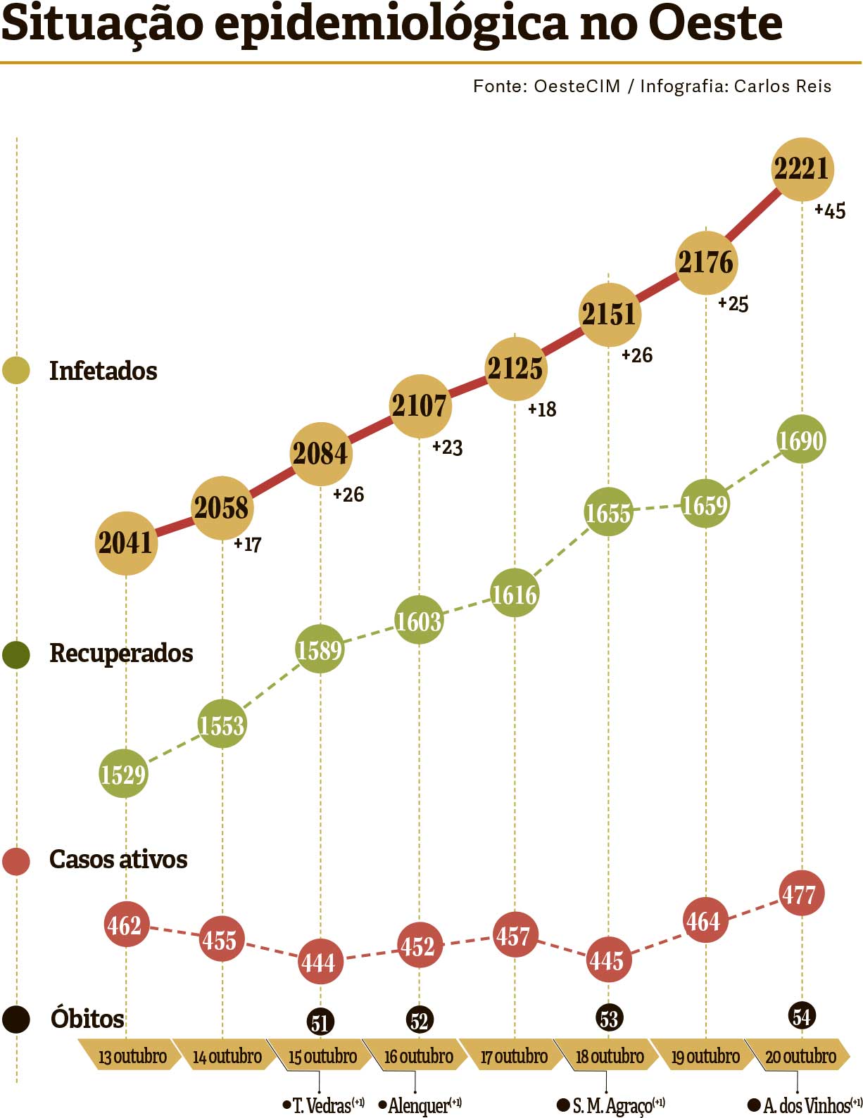 Foram registados esta semana no Oeste mais 180 casos de covid-19. Trata-se de um aumento a rondar os 8,8% face à última semana. Comparativamente com os dados da última semana há mais 15 casos ativos (são agora 477). Houve 161 recuperações e lamentam-se mais quatro óbitos: Torres Vedras, Sobral de Monte Agraço, Arruda dos Vinhos e Alenquer.