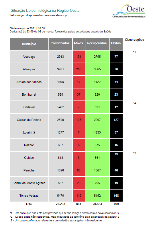 Desde o primeiro caso, em março do último ano, já foram infetadas 22233 pessoas no Oeste, sendo que 20663 já recuperaram. O coronavírus tirou a vida a 709 pessoas no conjunto dos 12 concelhos oestinos.