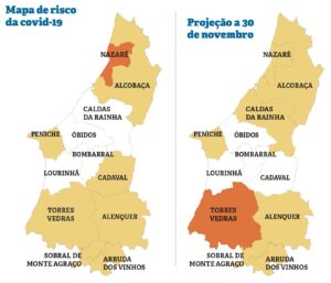 No segundo mapa, com a projeção dos últimos 14 dias (entre 16 e 30 de novembro), a Nazaré deixaria de estar no nível de risco muito elevado e passaria a figurar no risco elevado. Nos últimos 14 dias, o concelho registou 58 positivos, um rácio de 382 casos por cem mil habitantes. Torres Vedras faria o percurso inverso, passando a integrar os concelhos de risco muito elevado, com mais de 500 casos confirmados por cem mil habitantes nos últimos 14 dias (o patamar começa nos 480).
