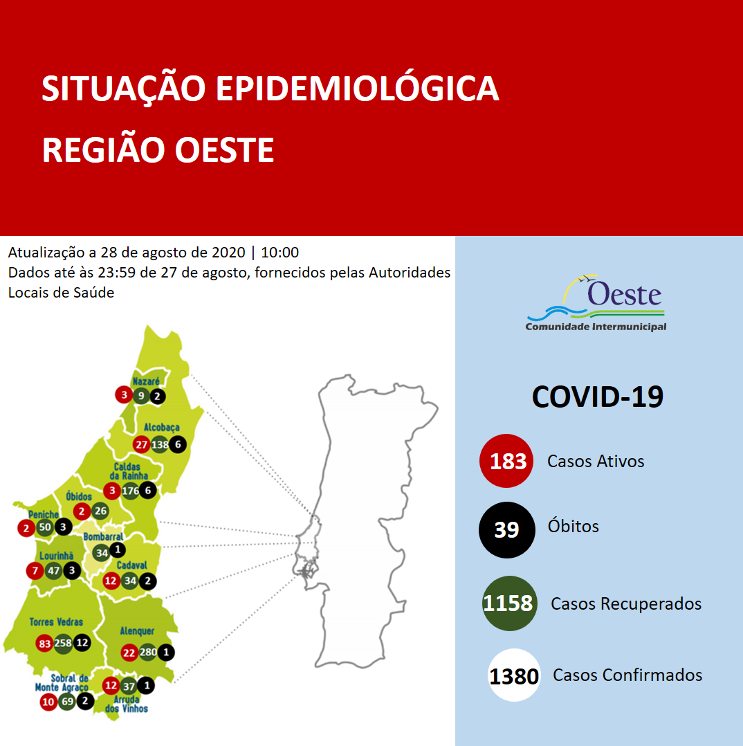 Torres Vedras registou, nas últimas 24 horas, 16 recuperações de Covid 19 e um novo caso activo. Conta actualmente com 83 infectados e 258 recuperações. Em Alcobaça verificaram-se sete recuperações e dois novos casos activos. Já os municípios da Nazaré e das Caldas apresentam, cada uma, mais um caso recuperado. Em Óbidos duas pessoas recuperaram da infecção, contando agora com dois casos activos.