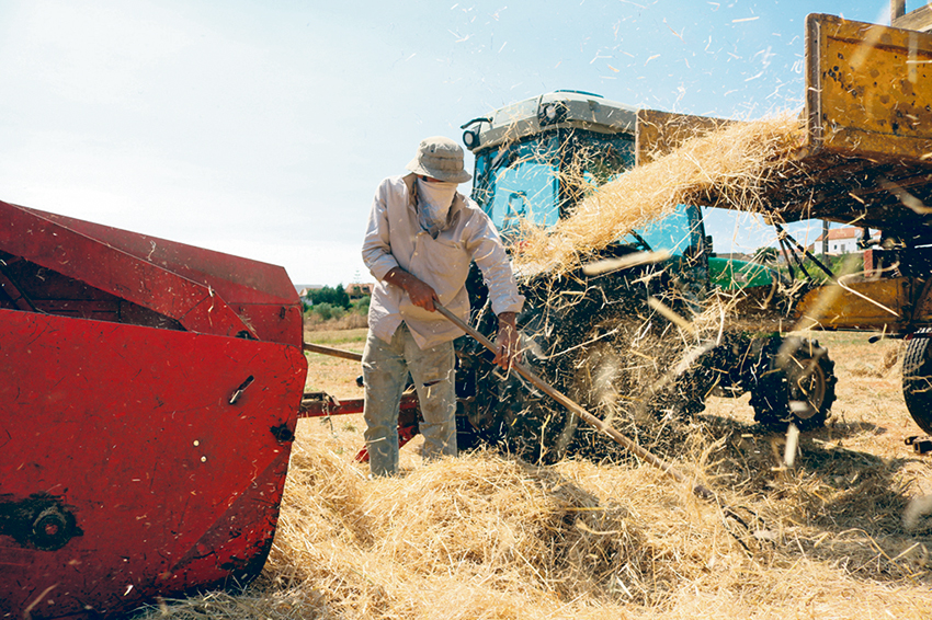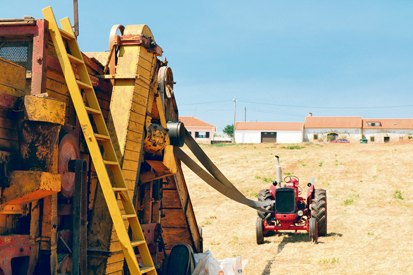 É ali no sopé da Serra de Montejunto, na aldeia da Póvoa do Cadaval, numa calorosa tarde de domingo, que encontramos meia dúzia de amigos a fazer a debulha do trigo como em meados do século passado. Duas máquinas com 70 anos são ligadas por uma grande correia: um tractor americano da série Farmall, que com uma grande correia faz tocar uma debulhadora, uma máquina imponente feita no Tramagal pela Metalúrgica Duarte Ferreira, e que recentemente levou uma nova lona no elevador, mas que se mantém a trabalhar “como nova”. Alimentada com as espigas, a debulhadora faz com que o trigo viaje para a frente e para trás dentro da máquina, passando por vários crivos (que variam consoante o cereal a debulhar) até sair apenas o grão para os sacos. A palha é separada e expelida nas traseiras, onde um funcionário a encaminha para uma enfardadeira.