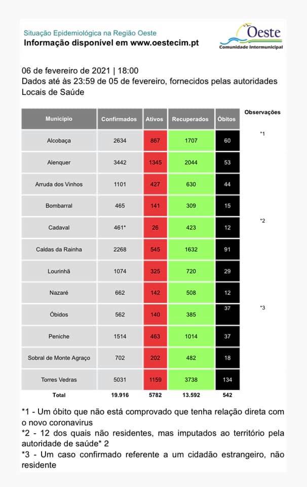 O relatório epidemiológico deste sábado da Comunidade Intermunicipal do Oeste revela a existência de mais 218 casos de infeção por covid-19 na região, além de 12 óbitos associados à doença.