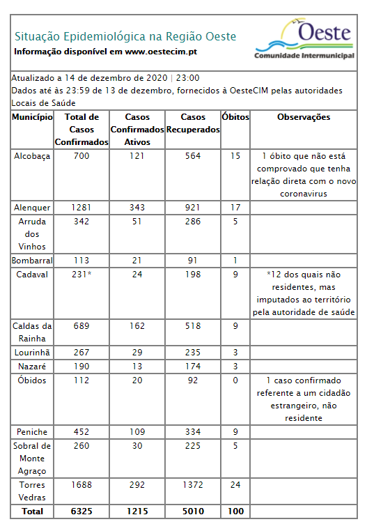 Os novos casos assinalam-se nos seguintes concelhos: Torres Vedras (26), Caldas da Rainha (17), Alenquer (13), Nazaré (10), Alcobaça (7), Arruda dos Vinhos (7), Bombarral (5), Peniche (5) e Óbidos (1).
