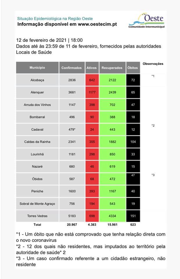 Registaram-se, ainda, mais 8 mortes associadas à covid-19: Óbidos (3), Caldas da Rainha (1), Nazaré (1), Alcobaça (1), Arruda dos Vinhos (1) e Sobral de Monte Agraço (1).