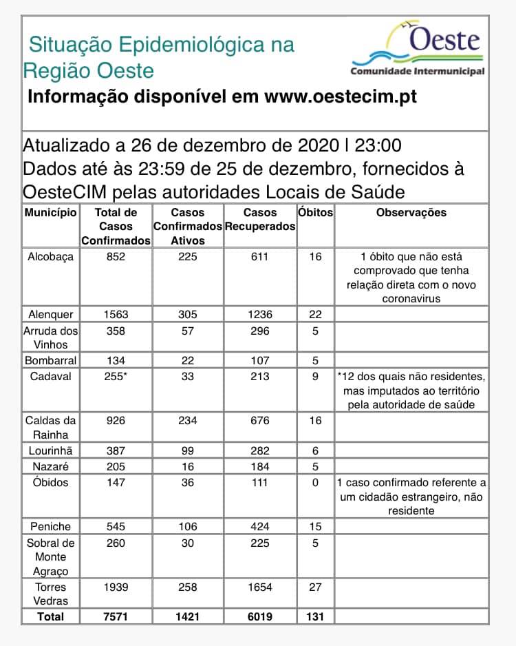 Relativamente ao relatório de 23 de dezembro, dez concelhos registam novos infetados: Torres Vedras (81), Caldas da Rainha (80), Alenquer (79), Alcobaça (45), Peniche (34), Lourinhã (13), Óbidos (9), Nazaré (6), Cadaval (4) e Bombarral (2).