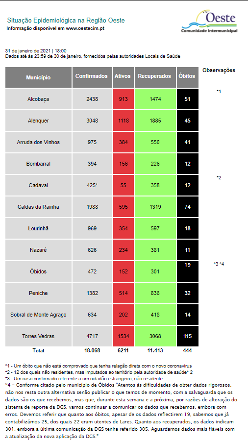 Em relação à véspera, há mais 286 casos, o que eleva para 18.068 o número de infetados no Oeste com o novo coronavírus, faltando atualizações sobre Caldas da Rainha, Alcobaça, Arruda dos Vinhos, Cadaval e Sobral de Monte Agraço.