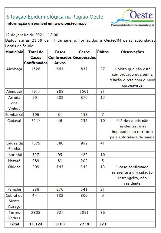 O relatório epidemiológico desta terça-feira da Comunidade Intermunicipal do Oeste revela que a região ultrapassou os 11 mil infetados, desde o início da pandemia, tendo registado mais 8 óbitos.