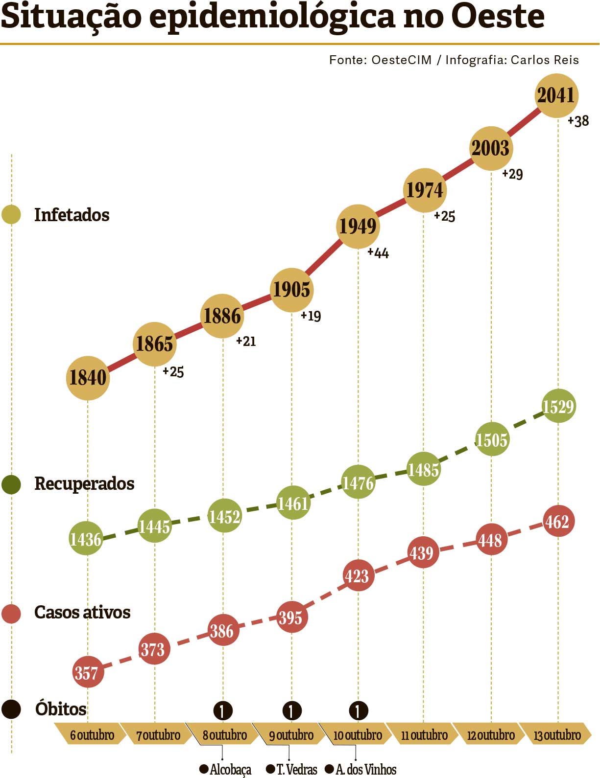 O Oeste ultrapassou a 12 de outubro a barreira dos 2000 casos confirmados de covid-19 desde o início da pandemia (o primeiro caso no Oeste foi registado nas Caldas, a 20 de março). Existem agora no conjunto dos 12 concelhos 2041 casos confirmados e 462 ativos, o maior número de casos ativos de sempre. Comparativamente com a última semana registam-se mais 105 casos ativos, tendo sido confirmados mais 201 casos.