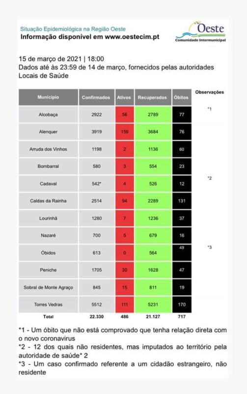 Comparativamente com os dados do dia anterior, há menos 26 casos ativos no Oeste, sendo agora 486 quando ontem eram 512.
