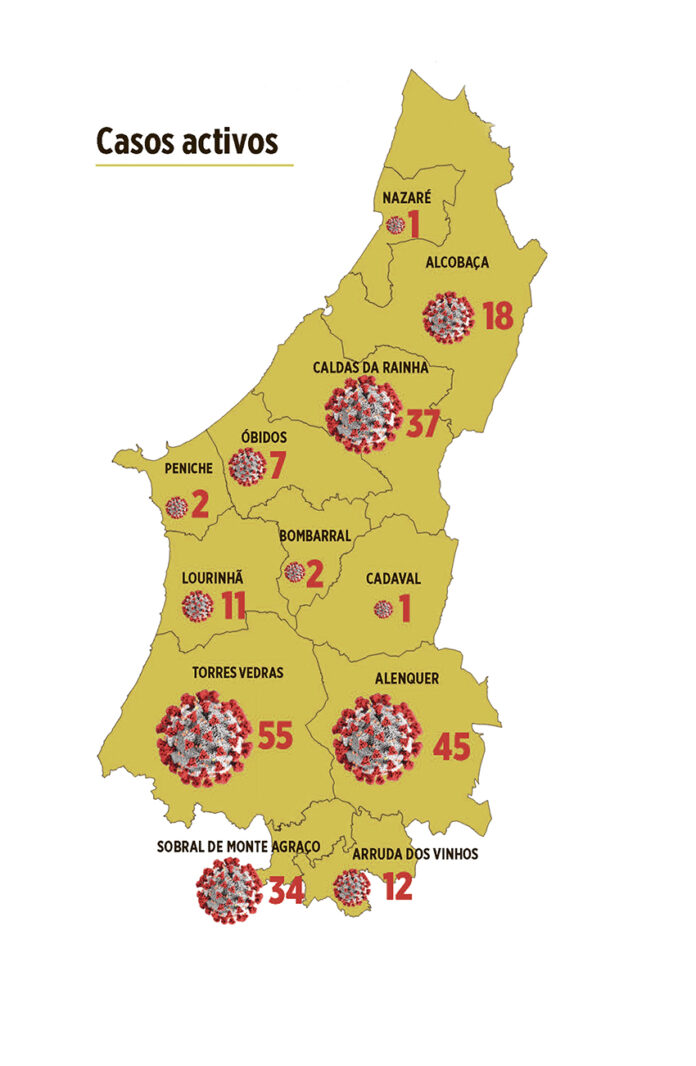 Na Lourinhã houve cinco novos casos e o número de activos subiu de sete para 11. O concelho de Alenquer tem mais três casos de covid-19, mas viu o número de activos descer de 67 para 45. Também em Torres Vedras se registaram mais 20 casos, mas o número de activos desceu de 70 para 55. Em Arruda dos Vinhos houve seis novos casos, aumentando o número de activos de nove para 12.