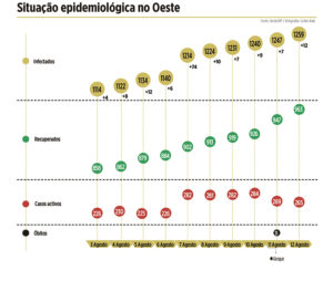 Desde o início da pandemia registaram-se nos 12 concelhos do Oeste um total de 1259 casos de infecção, sendo que 963 doentes já se encontram recuperados e mantêm-se 265 activos, além de 31 óbitos.