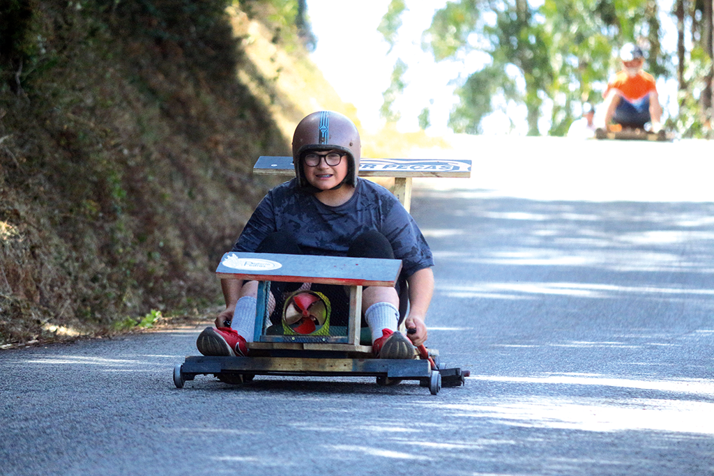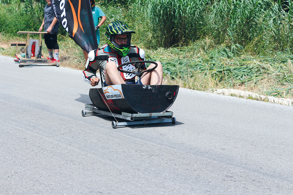 O jovem Simão frisa à Gazeta das Caldas que mal viu anunciada a corrida quis experimentar porque era uma coisa diferente. Começou por desenhar o que pensava que queria que fosse o seu carro, depois “tive que mudar algumas coisas, os rolamentos saíam fora, mas agora já está melhor, a pior parte é os travões”. O processo todo levou três dias. Usou madeira de paletes e o banco de uma cadeira, dando ao seu carrinho um design inspirado nos carros de Fórmula 1, “à procura da velocidade”. Os treinos durante a manhã permitiram-lhe “aprender a trabalhar com os travões e a controlar o carro e é uma coisa fixe, que nunca tinha experimentado”, afirma. “Eu não costumo trabalhar com estes materiais, mas gosto de mexer nas coisas, viver ao ar livre, não estar nas tecnologias”, partilha o jovem que vem para se divertir, mais do que para ganhar, e que realça o espírito de amizade que se vai sentindo entre todos os participantes. Vemo-los, animados, a torcerem uns pelos outros, a ficarem felizes pelos tempos dos “adversários” e a trocarem ideias e conselhos de como melhorar a performance dos carrinhos, num espírito e ambiente de boa-disposição. É que isto não é propriamente um campeonato, embora, fique o leitor a saber que existe o campeonato nacional de carrinhos de rolamentos!