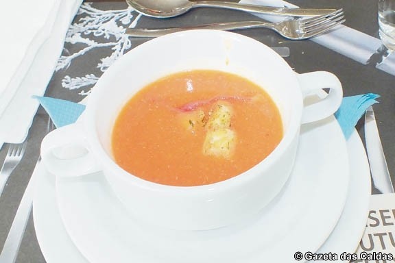 A sopa foi um creme de tomate com enchidos e croutons com manjericão orégãos, também muito apurado no sabor.
