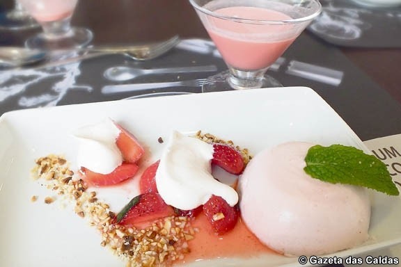 Para terminar a sobremesa foi uma bavaroise de morango com calda, amêndoa granulada e chantilly aromatizado com vinho da Madeira e canela. Esta sobremesa foi acompanhada pelo cocktail Primavera