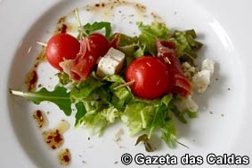 A começar na salada, uma Espetadinha de queijo feta com presunto de porco preto e tomate cherry e mistura de alfaces, na qual o queijo de origem grega casou muito bem com o presunto de porco ibérico, acompanhados pela frescura dos vegetais e o aroma da vinagrete balsâmica. Uma entrada fresquinha e leve para começar bem a refeição num dia quente, acompanhada por um aperitivo à base de ginja de Óbidos.