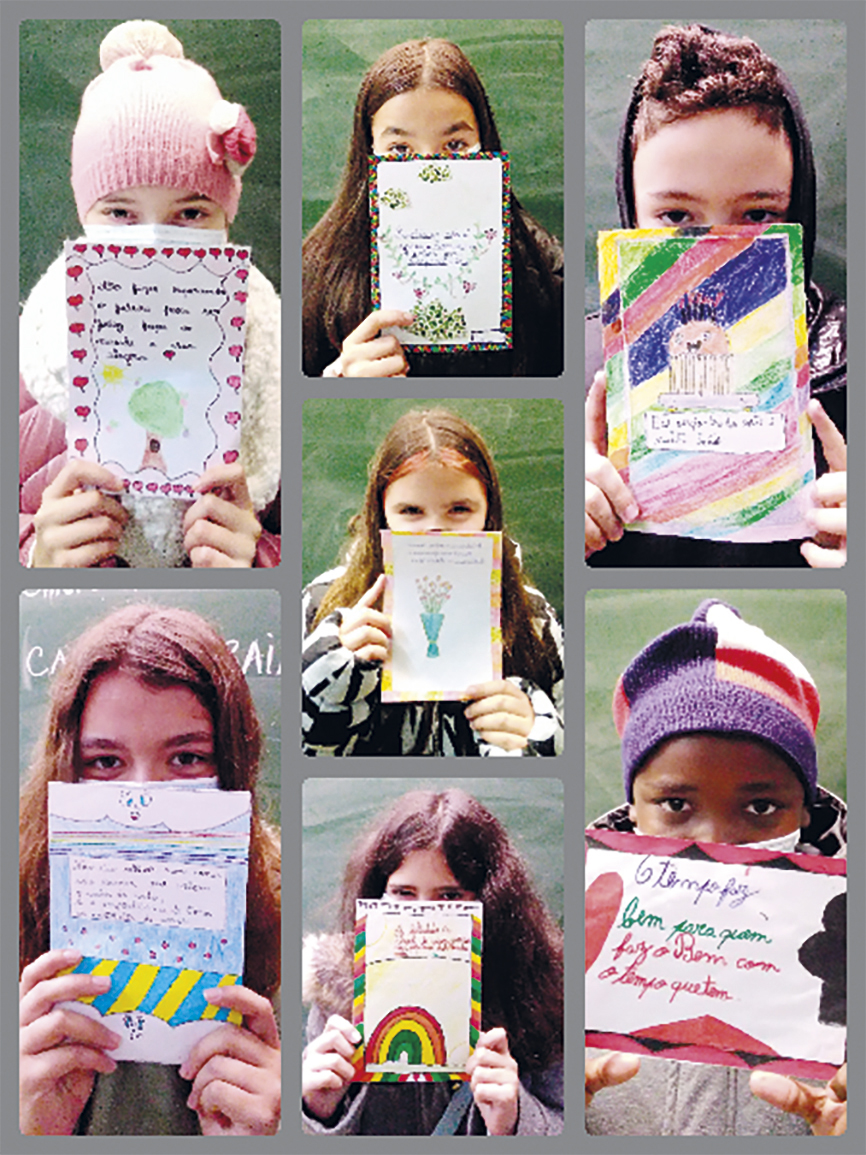 Alguns alunos escolheram frases de ânimo para colocar nos postais ilustrados. Outros preferiram escrever anedotas divertidas e outros, ainda, apostaram em poemas neste projeto “Cartões Amigos”.