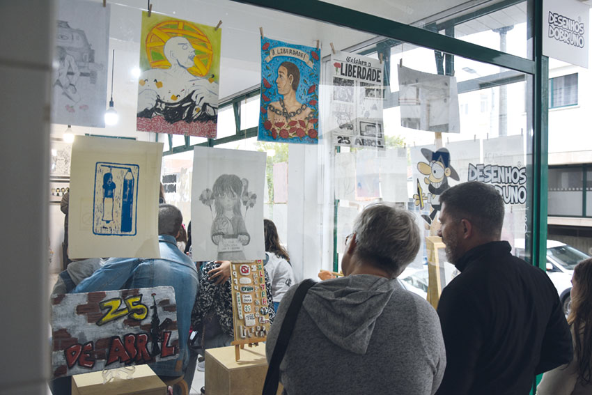 “(Bem) menores de 50 anos desenharam o 25 de Abril” intitula a mostra coletiva, patente até 30 de junho, na montra da Academia, dando também a conhecer aquele espaço de trabalho