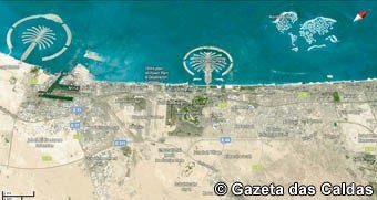 Resta-nos tentar apreciar mais de perto o edifício que nos conduziu aquela praia. Uma ponte particular impede-nos o acesso ao bonito edifício e contentamo-nos com as prévias, espantosas, descrições e bonitas fotografias. Qual libelinha minúscula, um helicóptero aterra na mais alta estrutura, exclusivamente usada como hotel (entretanto destronada pela Rose Tower também no Dubai), lembrando-nos do jogo de ténis aí se desenrolou no seu heliporto. Lugares fantásticos, inimagináveis, tornam-se agora quase palpáveis e levam-nos a lamentar não poder ver “O Mundo”. Ainda por terminar, um conjunto de 300 ilhas artificiais chamadas “The World” assumem no seu conjunto a forma do mundo. Cada ilha será uma propriedade e dependendo de seu tamanho, os proprietários poderão construir uma residência nela.