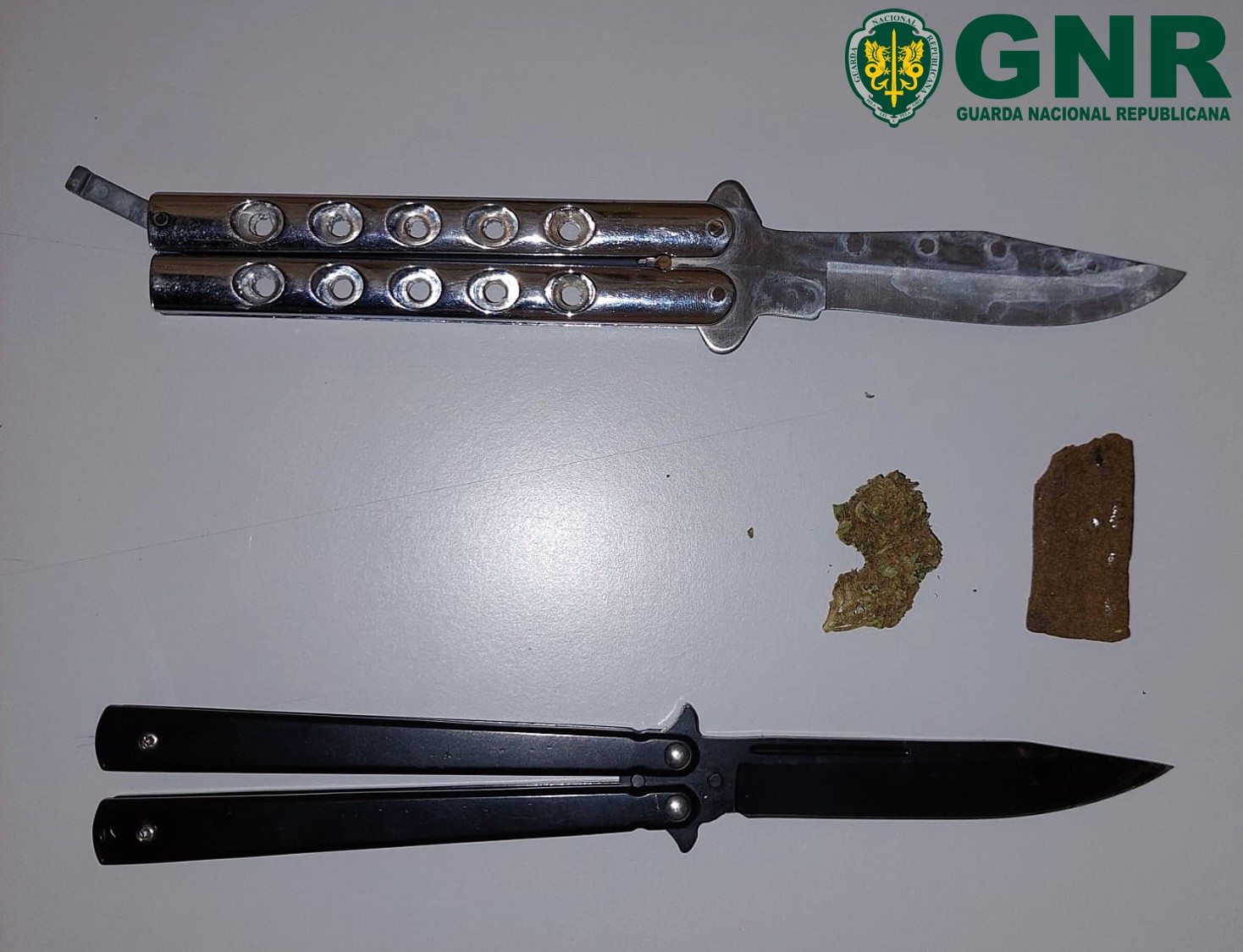 No decorrer de uma ação de fiscalização rodoviária, os militares da Guarda abordaram o condutor de um veículo que manifestou um comportamento suspeito. No decurso das diligências policiais, foi realizada uma revista pessoal de segurança e uma busca ao veículo, verificando-se que o suspeito tinha na sua posse oito doses de canábis e duas armas proibidas, vulgarmente conhecidas como “faca borboleta”, motivo que levou à sua detenção.