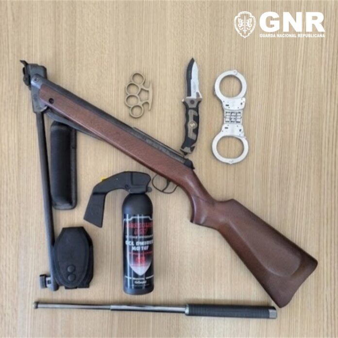Esta força militar acrescenta que “o indivíduo procedeu à entrega voluntária do material, motivo que levou à sua detenção” e à apreensão de uma navalha, uma soqueira, um bastão extensível, um par de algemas, um gás lacrimogéneo em gel e uma arma de pressão de ar, calibre 4,5.